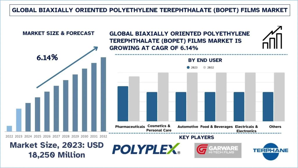 According to the UnivDatos analysis, growing demand from the food & beverages, pharmaceuticals and automotive industries will drive the growth scenario of Biaxially Oriented Polyethylene Terephthalate (BOPET) Films and as per their “Biaxially Oriented Polyethylene Terephthalate (BOPET) Films Market” report, the global market was valued at USD 18,250 million in 2023, growing at a CAGR of 6.14% during the forecast period from 2024 – 2032 to reach USD million by 2032.