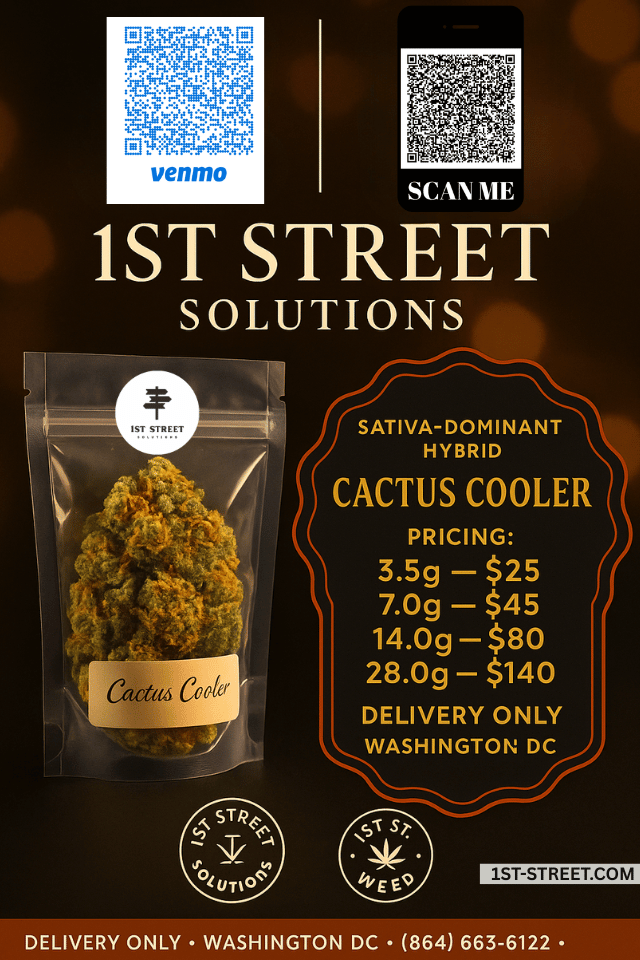 Energize your day with Cactus Cooler—a premium sativa hybrid with uplifting citrus flavor. Same-day DC weed delivery from 1st Street Solutions. Perfect for focus & creativity!
