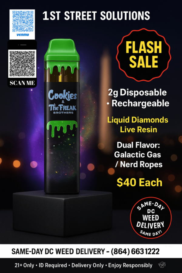 Get same-day DC weed delivery on a premium 2g rechargeable disposable by Cookies × The Freak Brothers. Liquid Diamonds live resin with dual flavors—Galactic Gas or Nerd Ropes at the push of a button. $40 each.