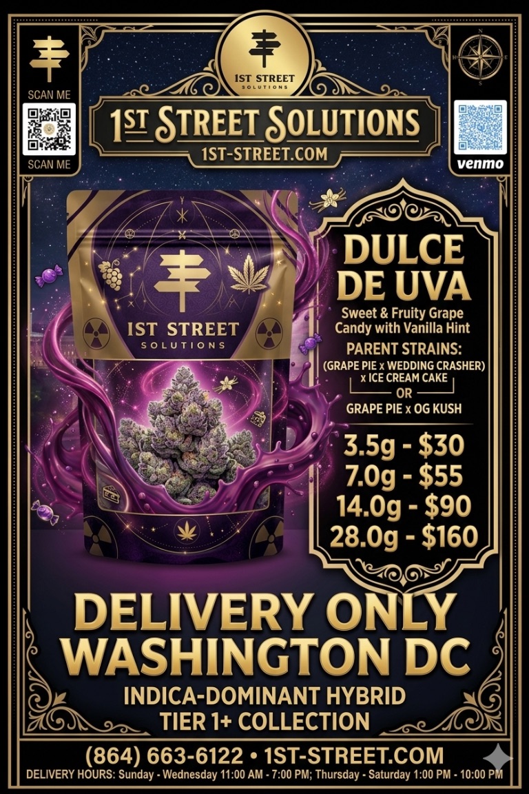 Experience the pinnacle of midnight luxury with the premier DC Weed Delivery service, featuring our exclusive Dulce De Uva. This Tier 1+ Indica-dominant hybrid envelops the senses with the irresistible essence of sweet, fruity grape candy and a delicate hint of vanilla, delivering a deeply relaxing, sophisticated high.