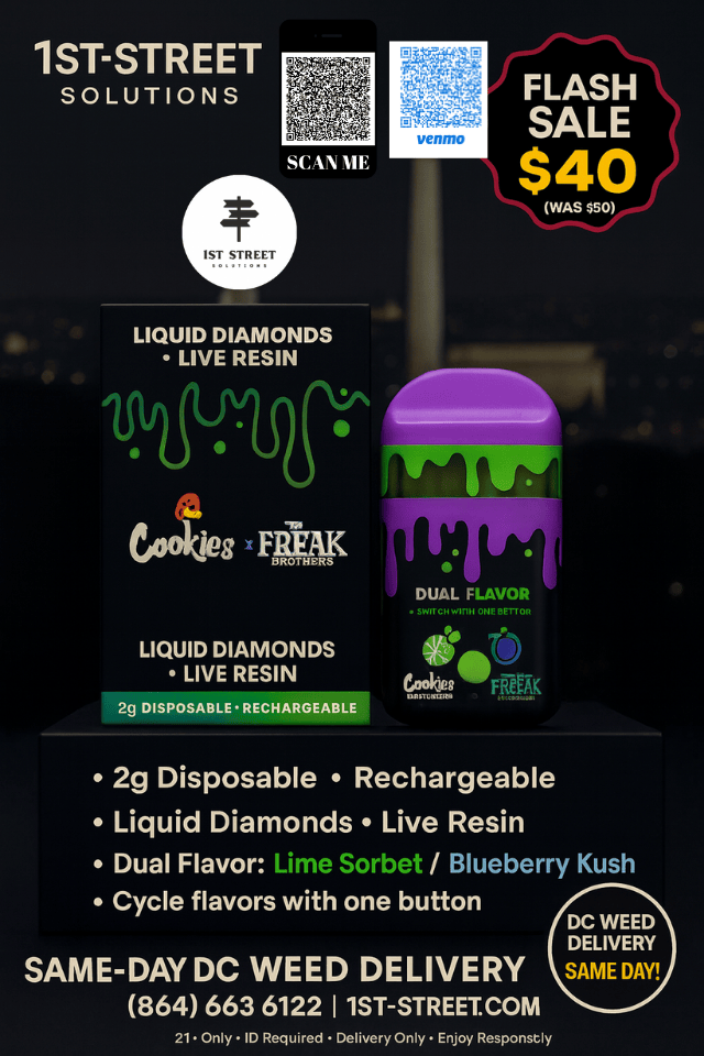 Uplift meets chill. This 2-gram dual-flavor disposable cycles between Lime Sorbet and Blueberry Kush with a single button. Rechargeable device, liquid diamonds live resin for bold terp flavor. Same-day DC delivery.