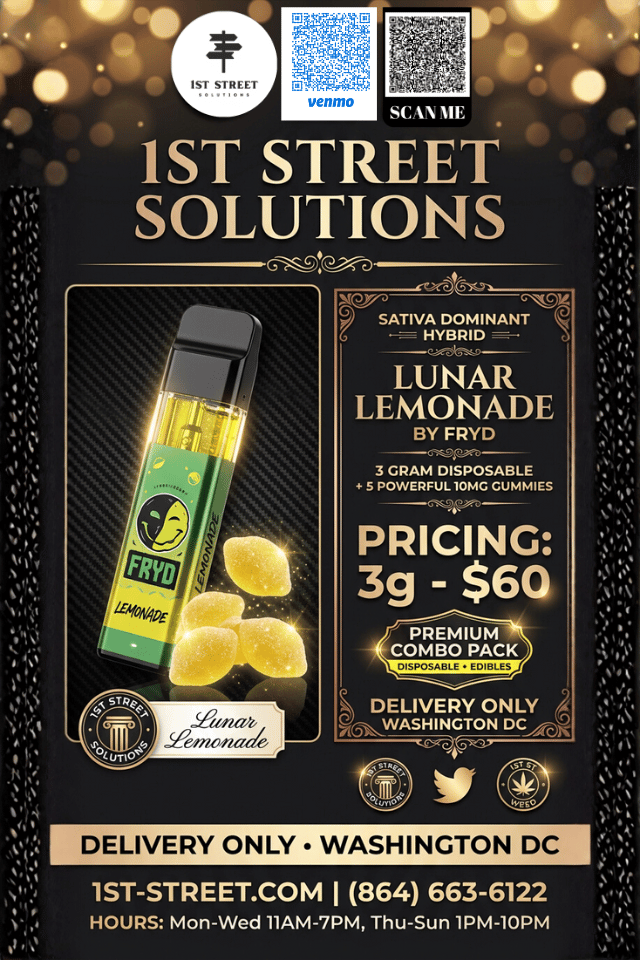 Elevate your DC experience with the Lunar Lemonade Premium Combo Pack, featuring a 3g Fryd disposable and five 10mg gummies. 1st Street Solutions provides the gold standard in DC weed delivery, bringing boutique quality and artisanal potency directly to your door.