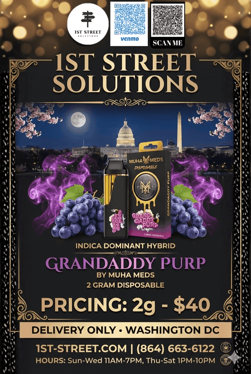 Experience the gold standard of Indicas with the Muha Meds Grandaddy Purp 2g Disposable. Bursting with legendary sweet grape and berry notes, this vape delivers profound relaxation for the ultimate evening unwind. Order now for fast DC weed delivery directly from 1st Street Solutions.