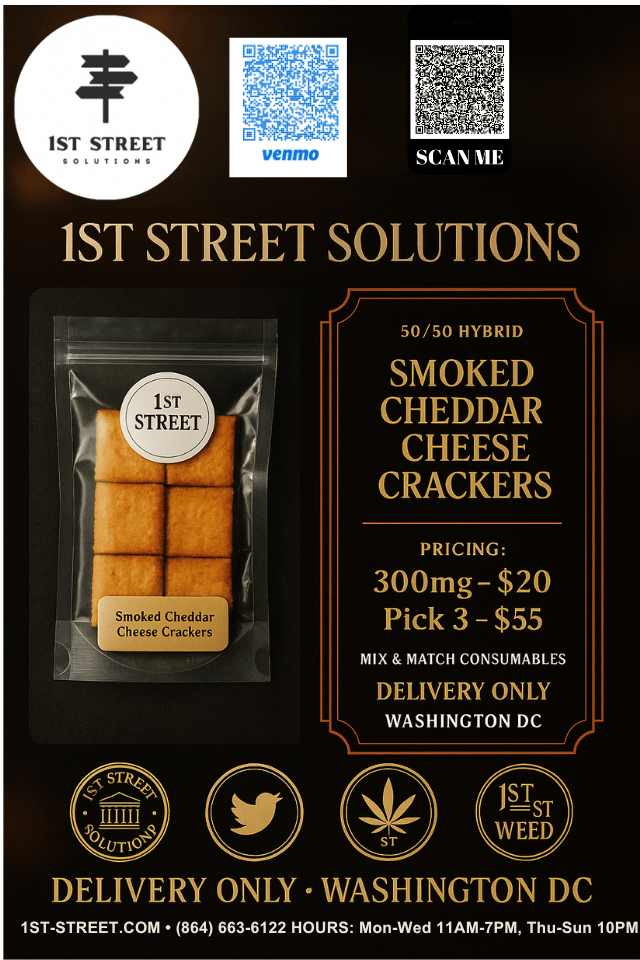 Tags: 300mg edibles, 50/50 Hybrid, cannabis crackers, Cannabis Delivery, DC dispensary delivery, DC Weed Delivery, discreet edibles, edibles delivery DC, gourmet cannabis, hybrid edibles, marijuana delivery DC, premium edibles, Same Day Delivery DC, savory cannabis snacks, savory edibles, smoked cheddar, THC crackers, Washington DC cannabis